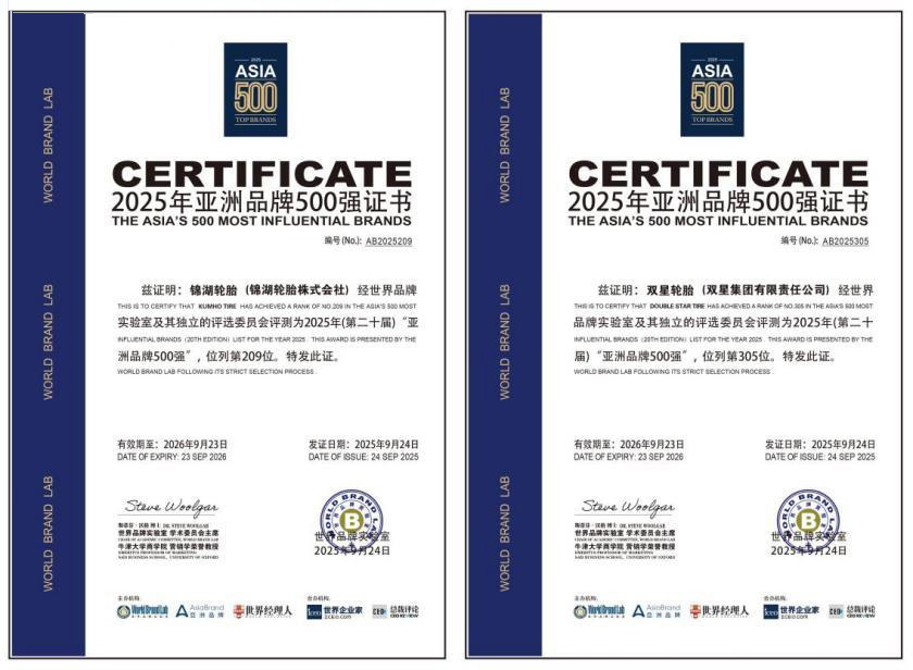 Kumho Tire и Doublestar Tire, два основных бренда китайской госкомпании Doublestar Group, вошли в рейтинг «500 самых влиятельных брендов Азии», обнародованный World Brand Lab на организованной этой независимой консалтинговой компанией конференции Asian Brand 2025, которая проходила на прошлой неделе в Гонконге.